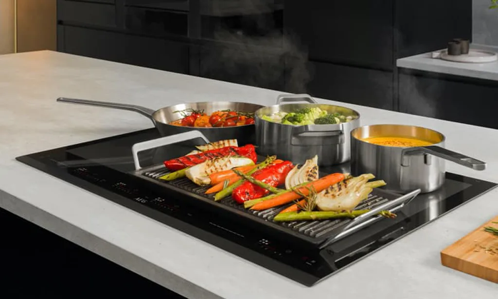 AEG : Poêle ou plancha, la table de cuisson FlexiBridge XT, avec hotte aspirante intégrée, accueille des ustensiles de cuisine de toutes tailles. Elle permet de combiner jusqu’à quatre zones de cuisson, qui peuvent être fusionnées à l’envi de part et d’autre du plan de cuisson.