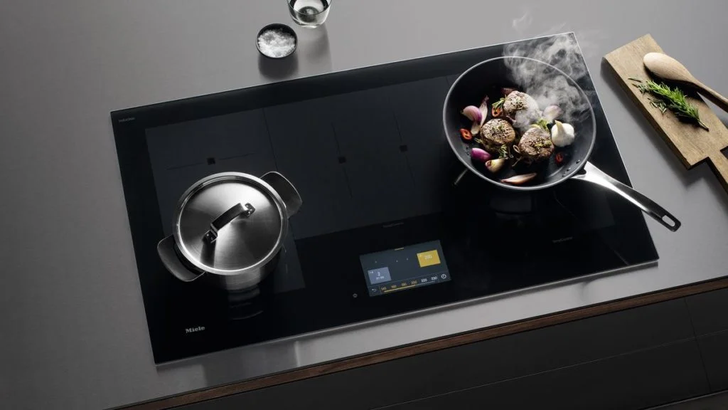 MIELE : La table à induction KM 7999 garantit un espace flexible jusqu’à cinq récipients et se commande via un écran tactile. Si un ustensile est posé sur la surface de cuisson, une zone colorée correspondante apparaît.